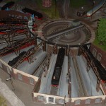 Die Nebenbahn besitzt an beiden Enden keine Schleifen, sondern eine Abstellharfe und eine interessante Abstelldrehscheibe, auf der die kurzen Züge gedreht werden können. Die Endpositionen der Drehscheibe werden mit zwei Schranktürriegeln festgelegt, die wohl auch für die Stromübertragung sorgen.