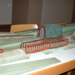 Blechbrücken aus der Sebnitzer Knopffabrik, gern auch als “Kneblbude” bezeichnet. Das Werk östlich von Bad Schandau versorgte die DDR nicht nur mit Knöpfen, Gürtelschnallen und geprägten Blechorden, sondern auch mit Blechbrücken für die Modelleisenbahn. Sie sind meist an der grauen Grundfarbe und einer rotbraun genebelten Fahrbahn erkennbar. In Bildmitte und hinten eine Fachwerkbrücke auf Blechpfeilern und eine Hängebrücke mit zwei Tragpylonen (hier passen die Blechpfeiler auch). Die Hängebrücke kann mit weiteren Elementen zusammengesteckt werden. Es gab u.a. auch eine Viaduktbogenbrücke mit sechs höheren Pfeilern aus Blech von der „Kneblbude“.