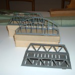 Zwei Varianten der Gitterbrücke 0/61/22 von Kibri. Sie ist eigentlich noch recht häufig. Die vordere Variante stammt aus den ersten Nachkriegsjahren und weist eine Besonderheit auf: Die eingesetzten Bögen wurden aus Dosenblechdeckeln gestanzt, die konzentrischen Ringe sind noch gut erkennbar.