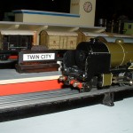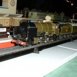(12e) The wonderful “Dover” 4-4-0 Express locomotive headed a Southern scale coaches train into TWIN CITY. This SR loco, and the long SR coaches, were announced by TTR in 1939, but not manufactured due to the war. The loco eventually appeared in 1959, but only 1000 were produced, fitted with the DC Permamotor, and finished in BR livery. Franz Nowak now builds a replica body shell of the AC version. The loco and scale coaches are often painted in Southern livery.