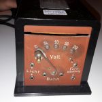 Dieser BING Wechselstrom-Transformator, Frontansicht, stammt aus der Fabrikation von Eduard Hoffmann, Baujahr ca. 1930. Hoffmann arbeitete als Zulieferer für mehrere Modelleisenbahnhersteller. Nach dem Konkurs seines Unternehmens im Jahr 1932 wurde die Produktion in der Meißener Firma Mesco unter der Markennahmen Electric weitergeführt. Mehr zu diesem Thema gibt es im TRIXSTADT-Artikel Electric-Transformatoren.