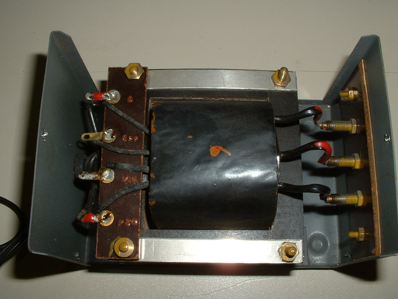 Ein Blick in das Innere des sehr solide gebauten Transformators: primärseitig war es möglich, diesen Transformator für Haushaltsnetze mit 125 V, 145 V und 220 V anzupassen.