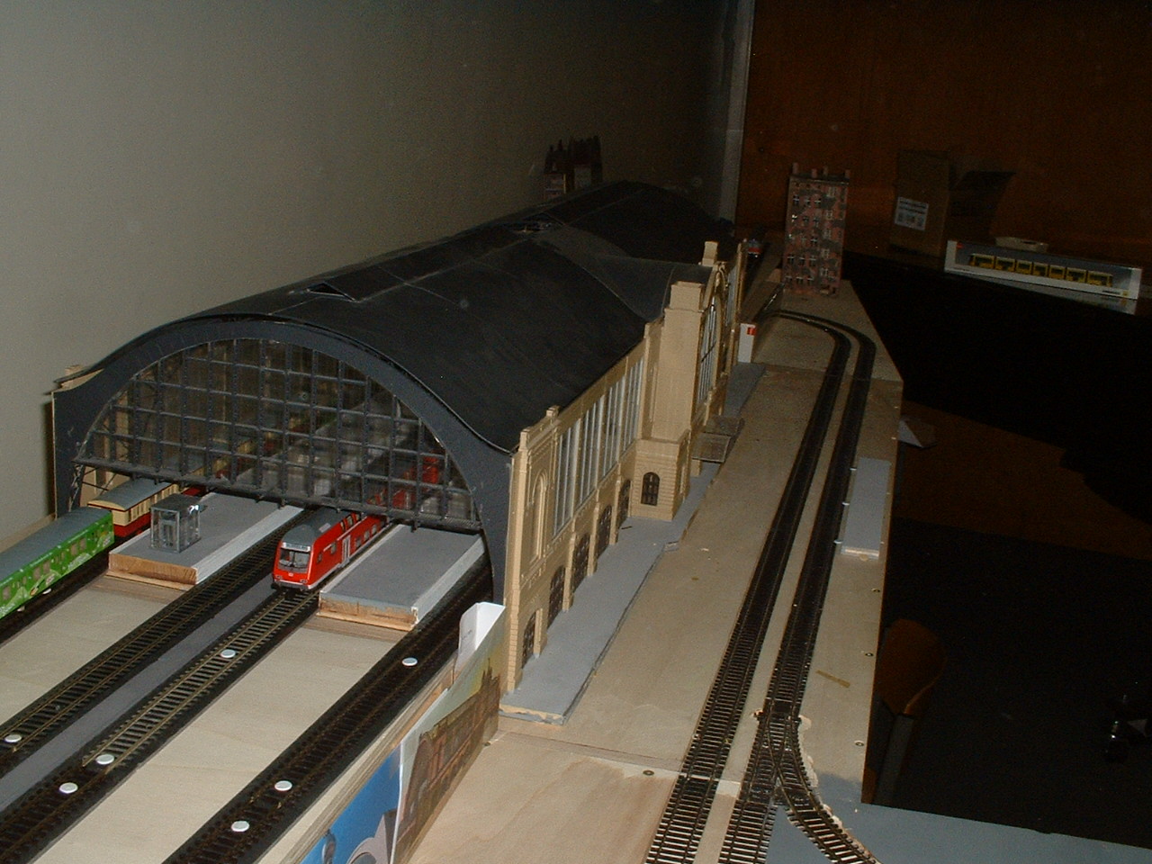 Schließlich soll noch dieser Hallenbahnhof gezeigt werden. Es handelt sich um das TRIX-Modell des Hamburger Bahnhofs Dammtor, der sich ideal für eine Stadtbahnstrecke eignet. Er wird gerade für eine Erweiterung der GHO-Modulanlage angepasst. Auf der Bodenplatte wurden bereits Straßenbahngleise verlegt.