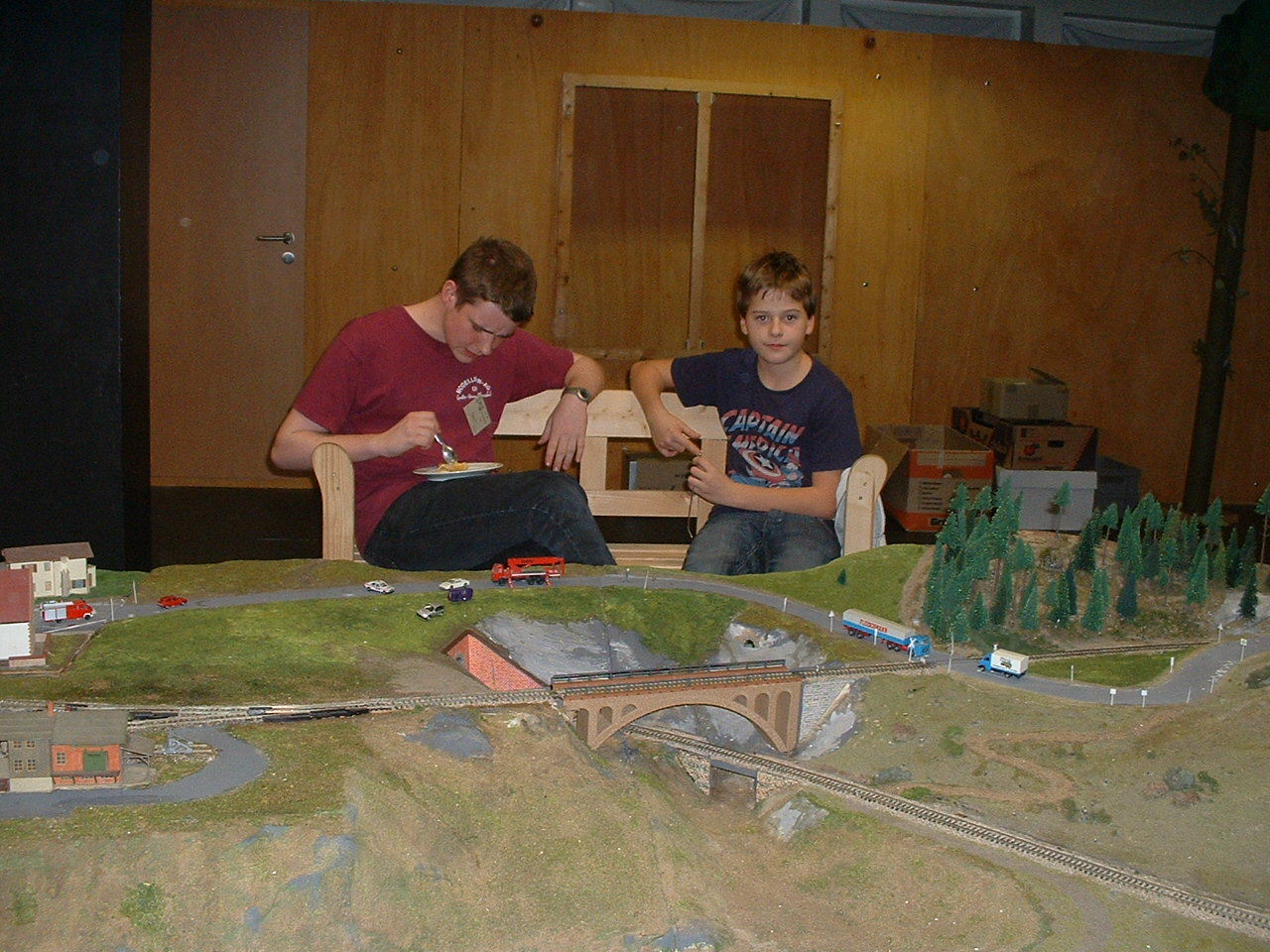 Wie bereits in den letzten Jahren haben wir die Dynamos von zwei aufgebockten Fahrräder an unsere Stammtischanlage angeschlossen, damit die Kinder den Fahrstrom für die Züge auf den beiden inneren Kreisen selber erzeugen können.