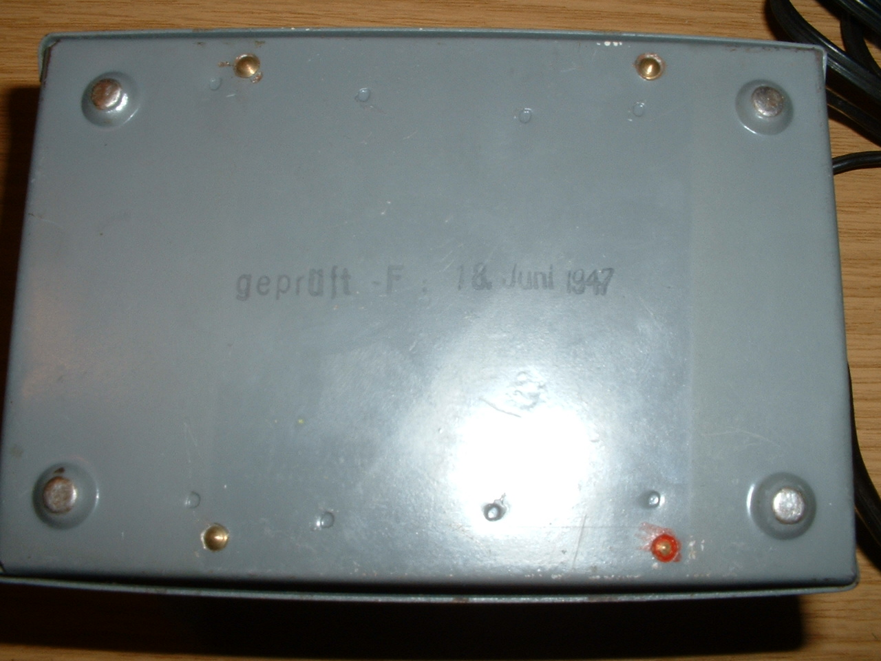 Die Unterseite des Transformators: „geprüft – F: 18. Juni 1947“