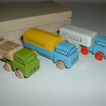 Nun geht es wieder zu den Holzprodukten. Hier gibt es ein Sortiment mit sechs Lastwagen aus dem Erzgebirge: Zunächst der Langholz-Sattelschlepper, der Fernverkehrs-Lkw und der Eisfrisch-Kühlwagen-Sattelschlepper. Auf der Schachtel ist der Stempel 1421/1 aufgedruckt.
