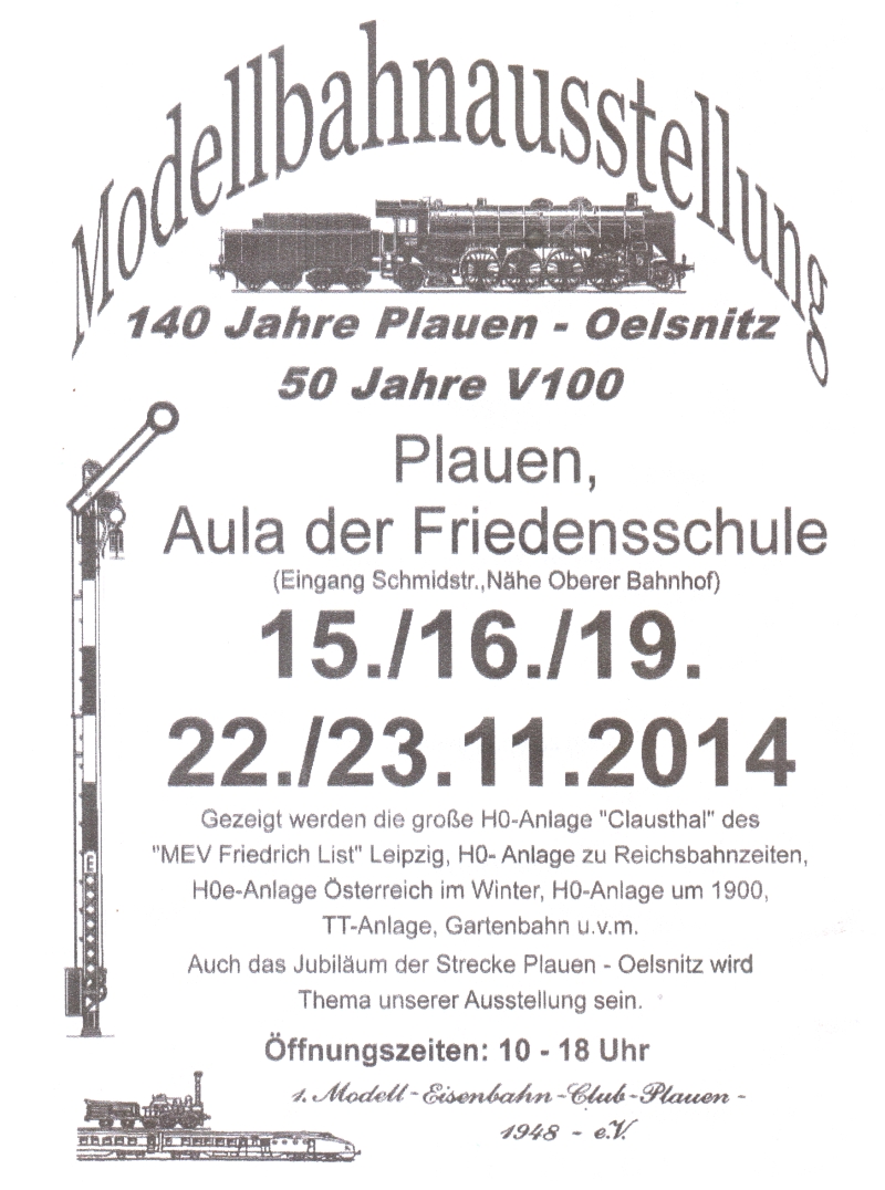 – 15.11. (Samstag) und 16.11.2013 (Sonntag), 19.11.2013 (Mittwoch, Buß- und Bettag) sowie 22.11. (Samstag) und 23.11.2013 (Sonntag) Modelleisenbahnausstellung des 1. MEC Plauen (Homepage), weitere Informationen auf dem Ausstellungsplakat 2014